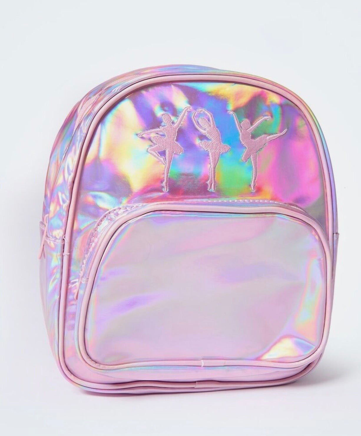 The Mirella ballerina backpack is perfect for young dancers on the go. Made with an iridescent material, it features a ballerina image and a zip pocket for hair accessories. With adjustable straps and a hand strap at the top, this backpack is both stylish and functional.